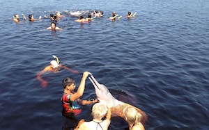 Die rosafarbenen Flussdelfine -Die Botos – Bei diesen Ausflug besuchen wir die rosafarbenen Delfine und können auch mit ihnen schwimmen gehen. Während des Aufenthaltes in der Acajatuba Lagune ist es fast unmöglich keine Delfine zu sehen.